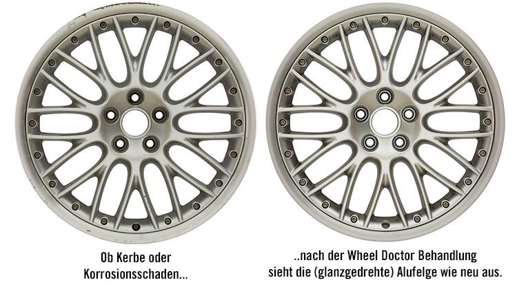 Dazu wird die Felge auf die Wheel Doctor Maschine gespannt und mit einer Diamantschleifmaschine hochpräzise abgeschliffen. Durch Überlackieren mit speziellen Aluminiumlacken wir die Felgenoberfläche wieder in einen makellosen Zustand gebracht. Die preiswerte Alufelgen-Aufbereitung mit dem Wheel Doctor erspart den kostenintensiven Austausch von abgeschürften Alufelgen.